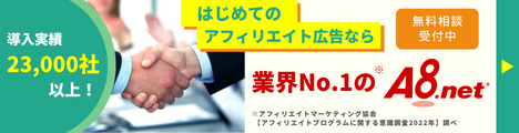 【広告主募集】アフィリエイト・プログラムは効果の有無によって広告費が発生する成果報酬型のネット広告です。したがって広告主にとって費用対効果が非常に高い広告を実現できます。日本最大級のアフィリエイト・ネットワークを持つA8.netをご利用いただければ現代の“生きた”広告手法を実感いただける筈です。 |